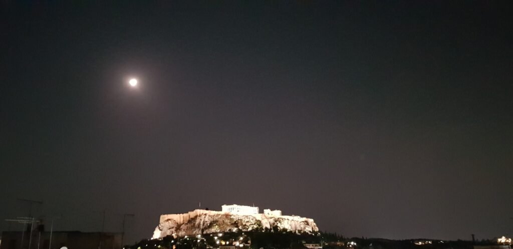 The Acropolis of Athens at night.